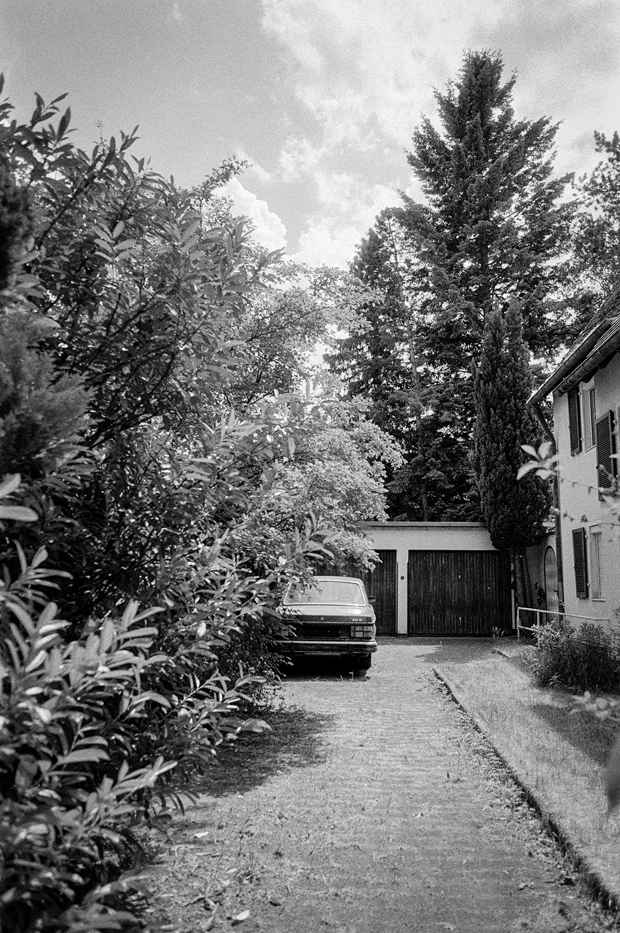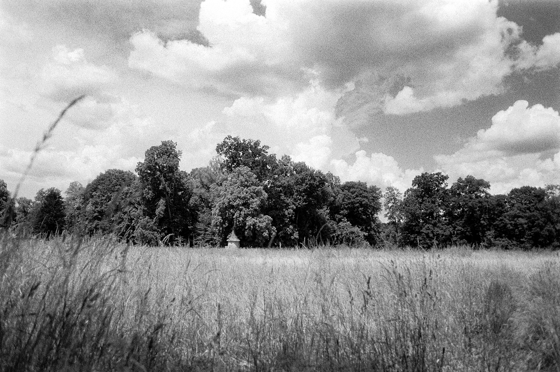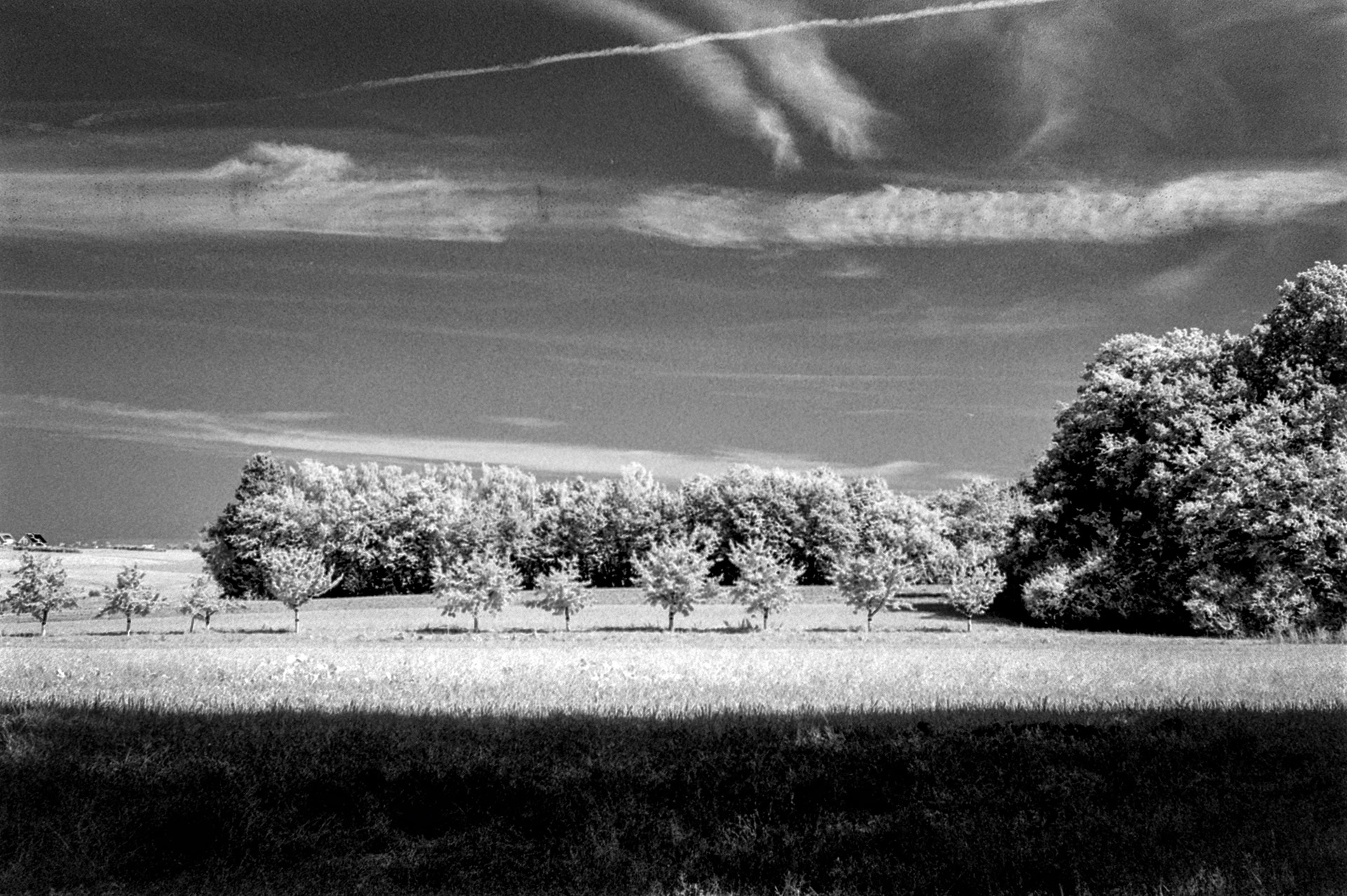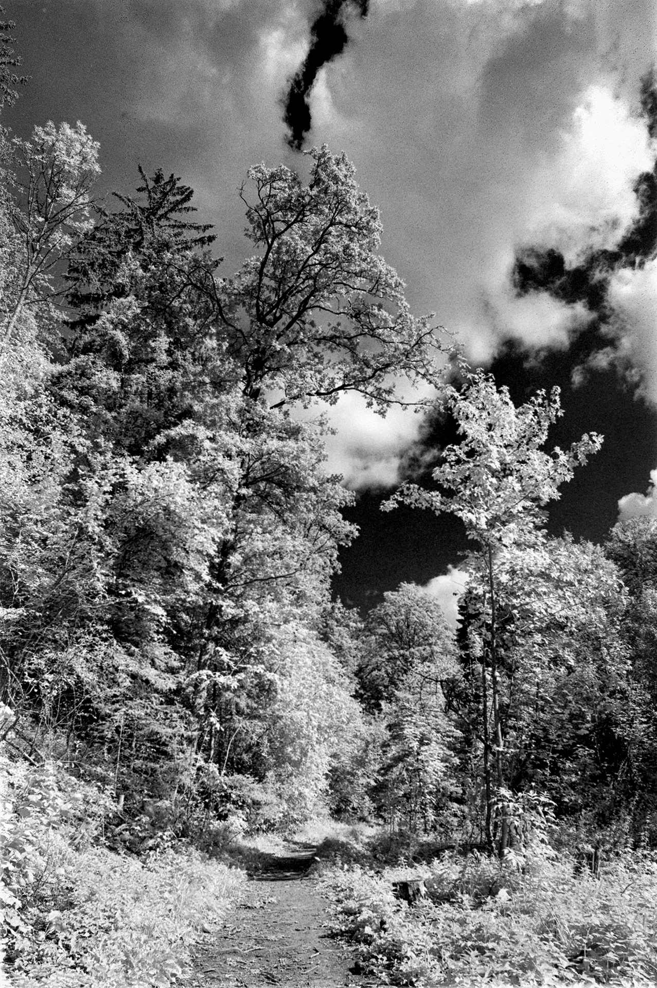 Meine ersten Versuche mit dem Ilford SFX200 habe ich in Kombination mit einem weniger starken Rotfilter gemacht. Alle Bilder sind mit der Nikon F401x und dem Nikon AF Nikkor 24mm f/2.8 D fotografiert. Ich habe dabei den Autofokus der Kamera verwendet und keine Korrekturen vorgenommen, wie sie bei echten Infrarotaufnahmen notwendig sind. Ich habe mir extra Motive mit hohem Kontrast, Himmel, Wolken und Bäumen gesucht. Mit großer Spannung habe ich gewartet, bis ich die Negative scannen konnte und war dann doch etwas enttäuscht: starke Körnung und ein sehr geringer Effekt. Dennoch sind die Fotos schön kontraststark geworden aber der versprochene Wood-Effekt ist nicht eingetreten.