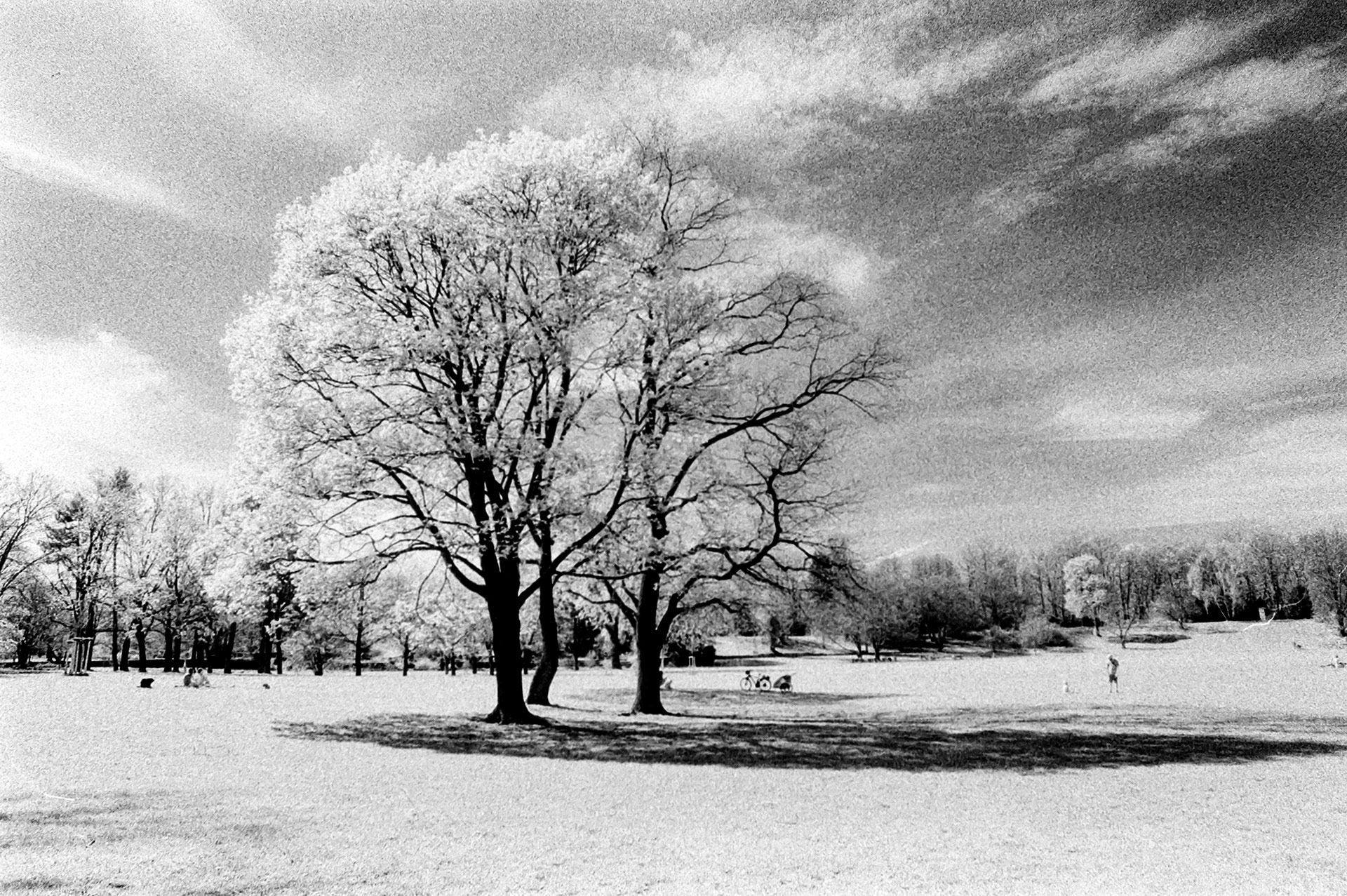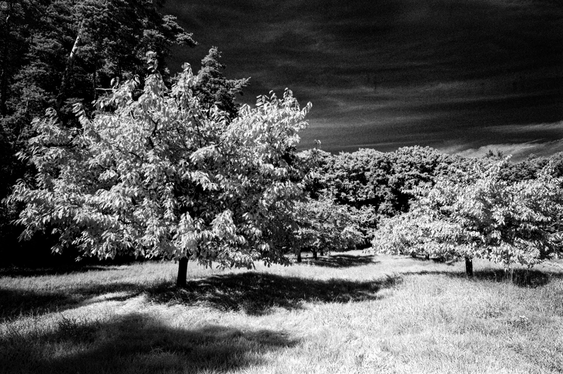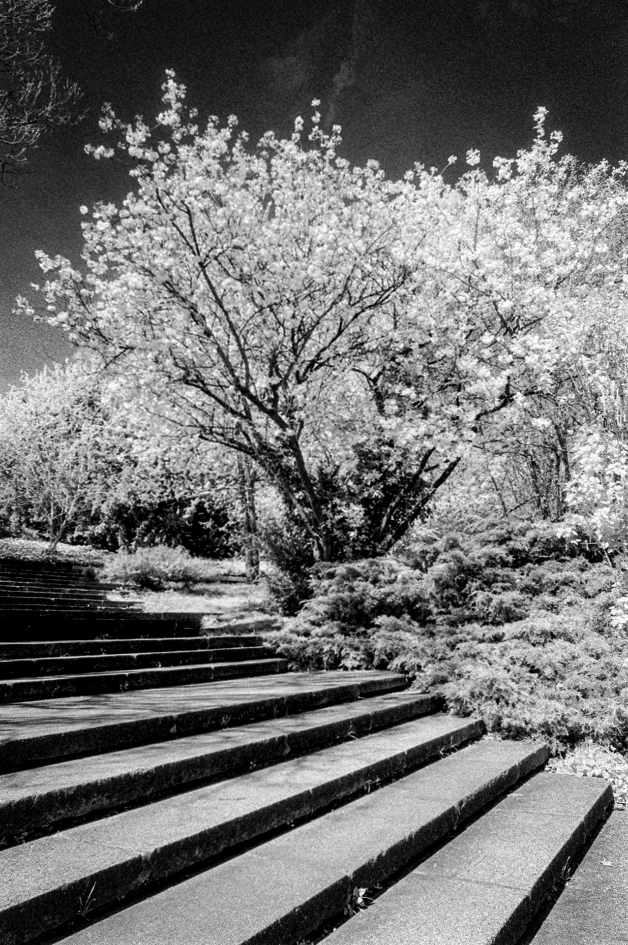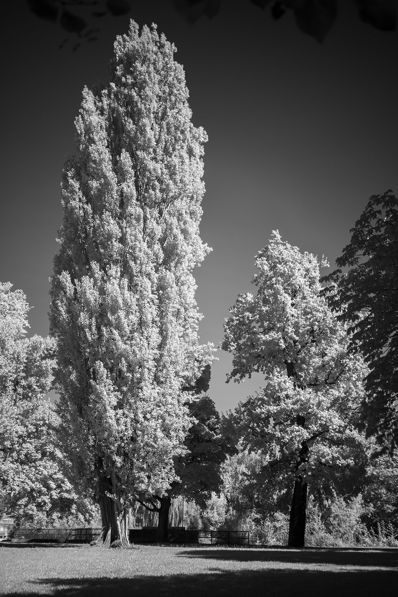 Das sind die typischen schwarz-weiß Infrarot-Fotos, bei denen der blaue Himmel in tiefem Schwarz leuchtet und das Grün der Blätter der Bäume gleißend weiß erscheint – weil Blätter infrarotes Licht reflektieren.