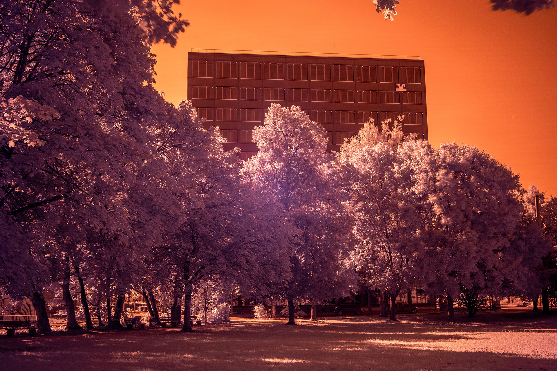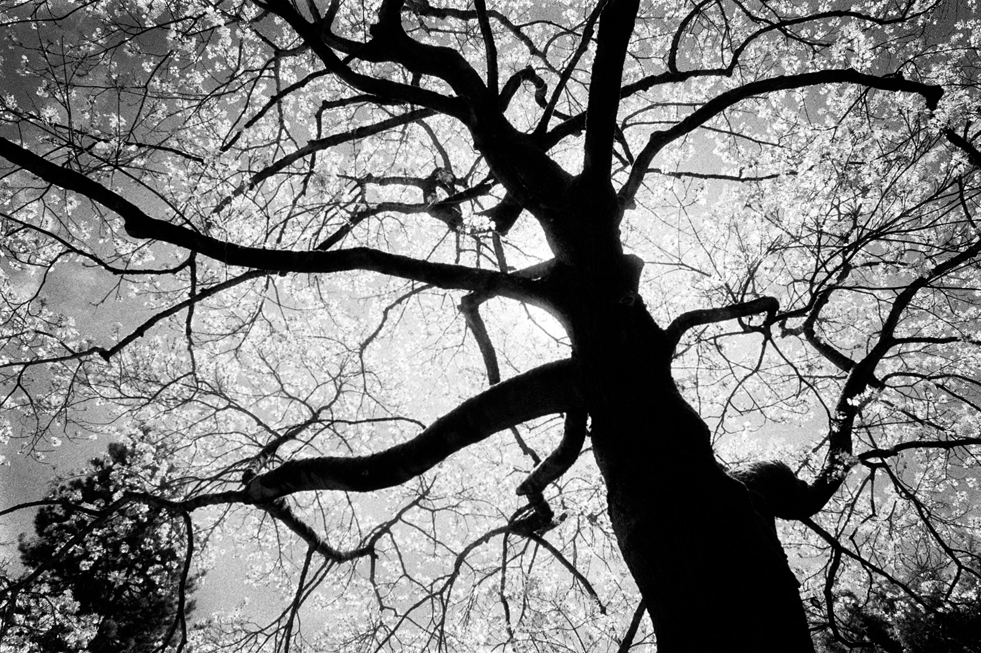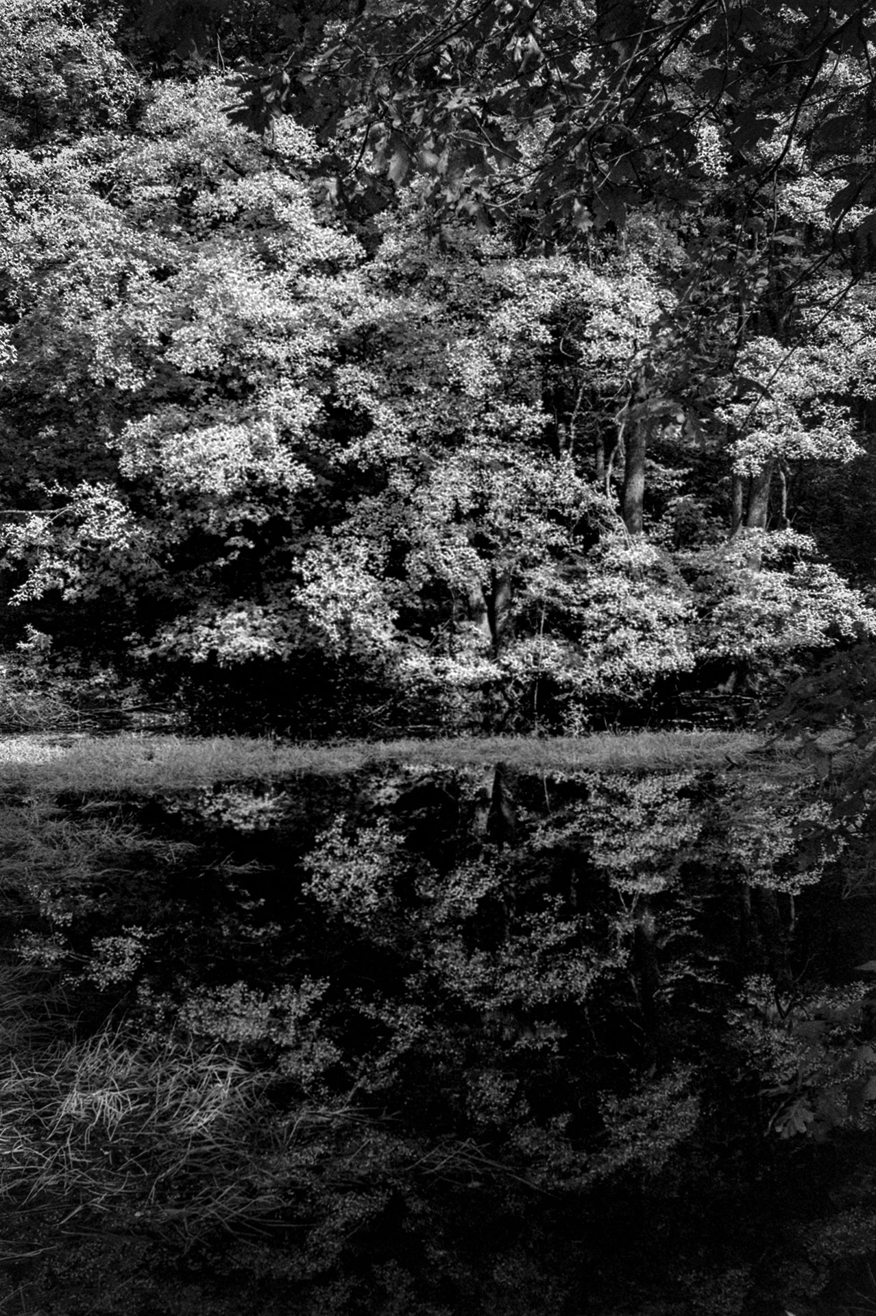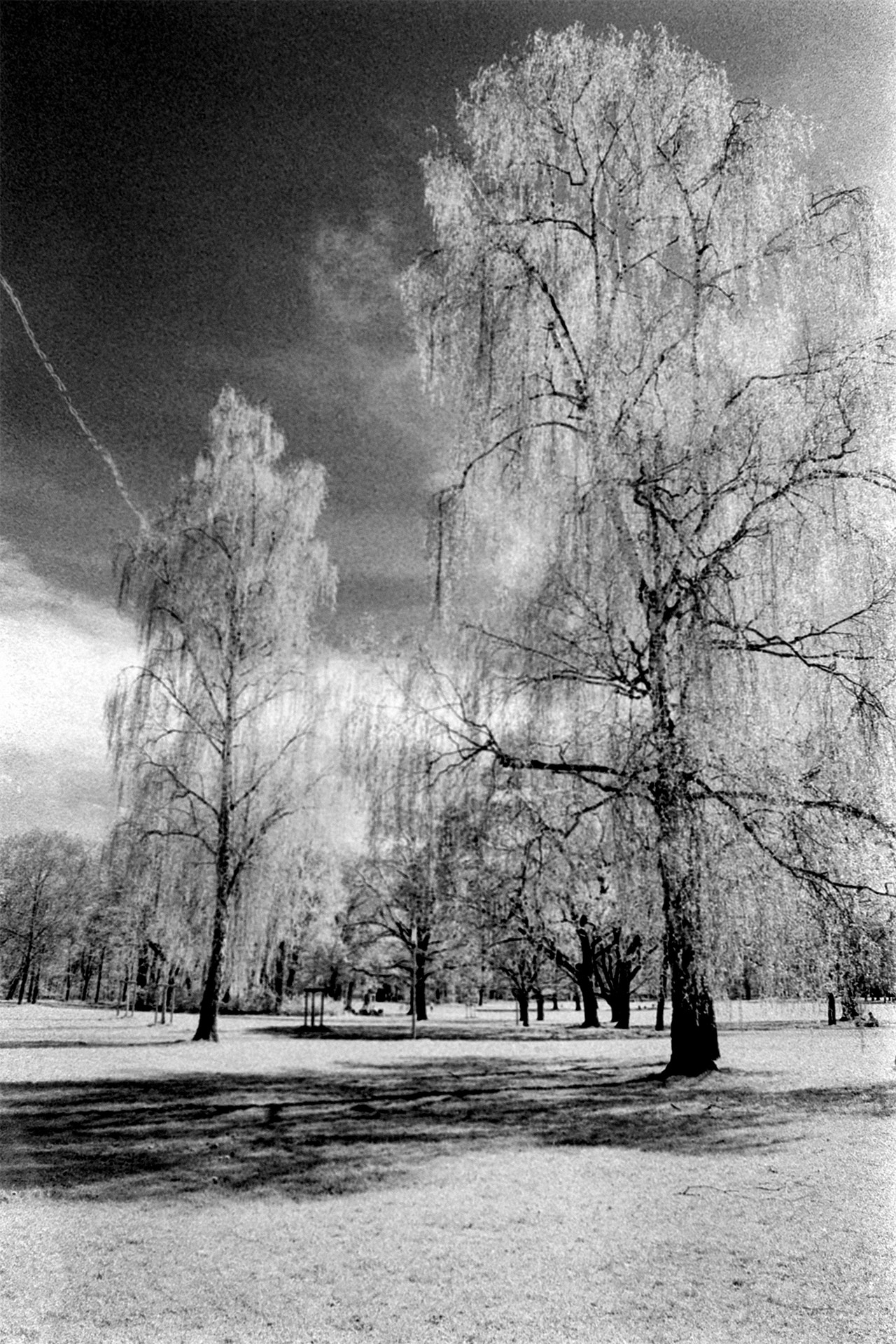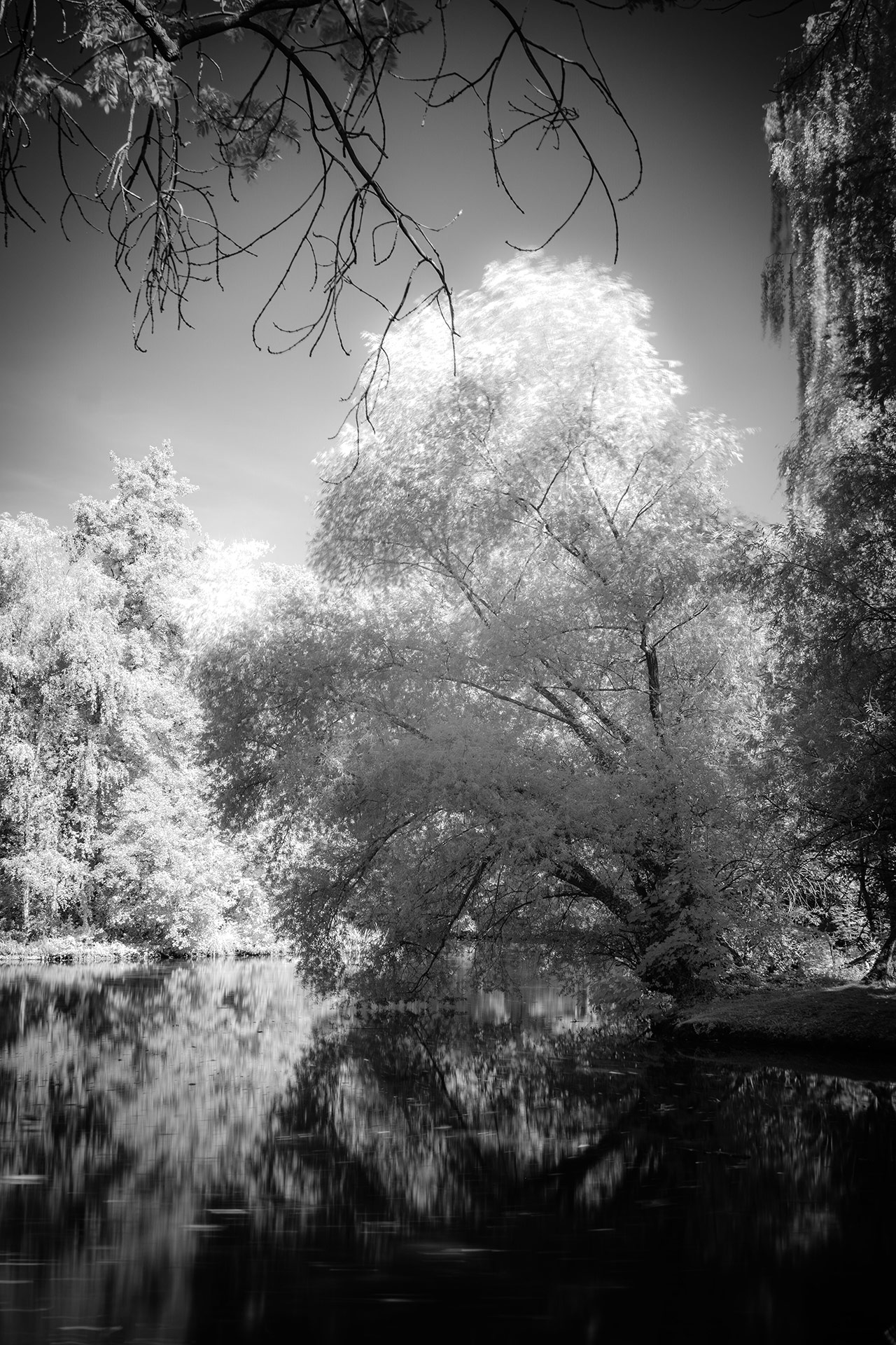 Das sind die typischen schwarz-weiß Infrarot-Fotos, bei denen der blaue Himmel in tiefem Schwarz leuchtet und das Grün der Blätter der Bäume gleißend weiß erscheint – weil Blätter infrarotes Licht reflektieren.