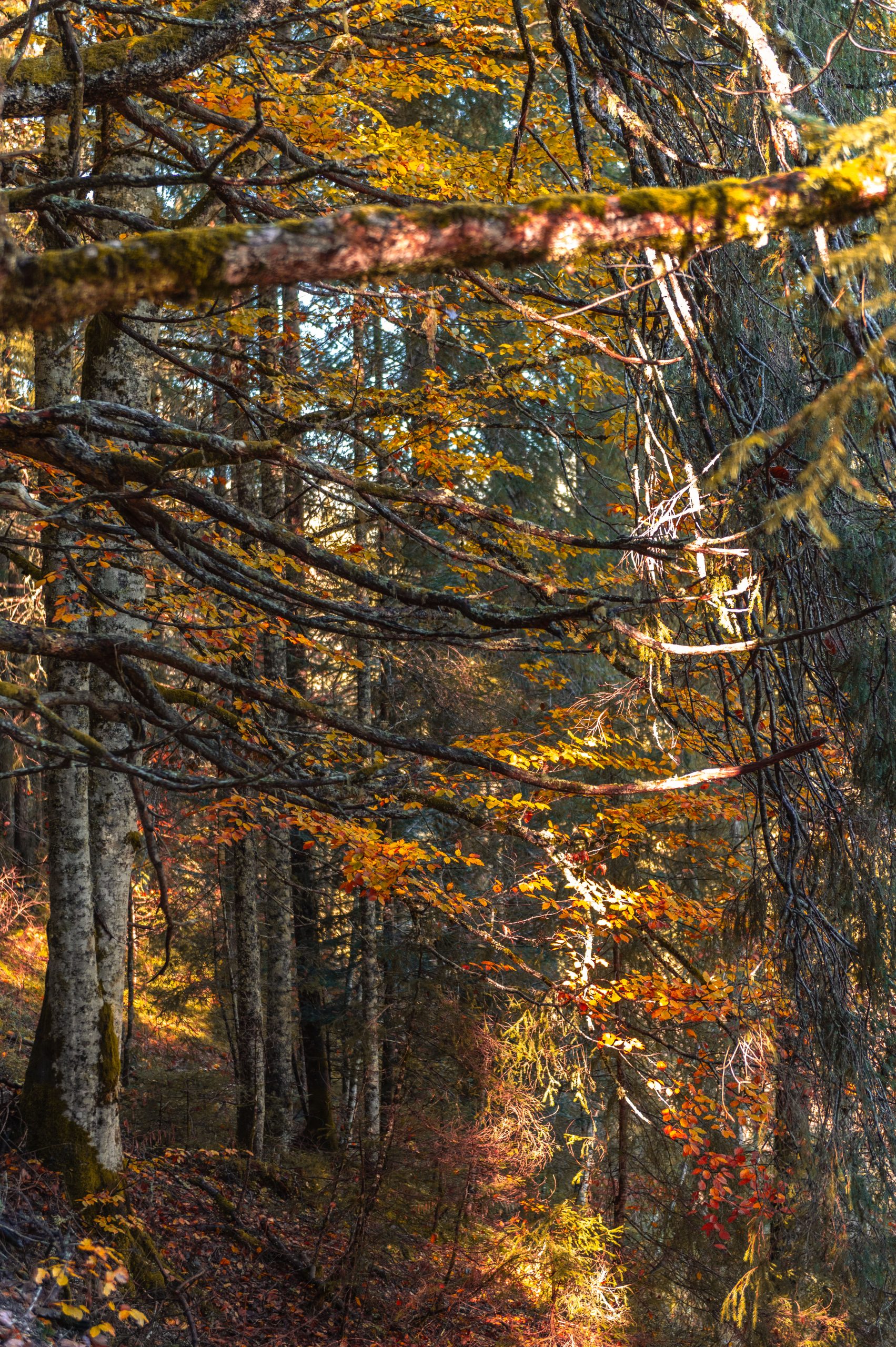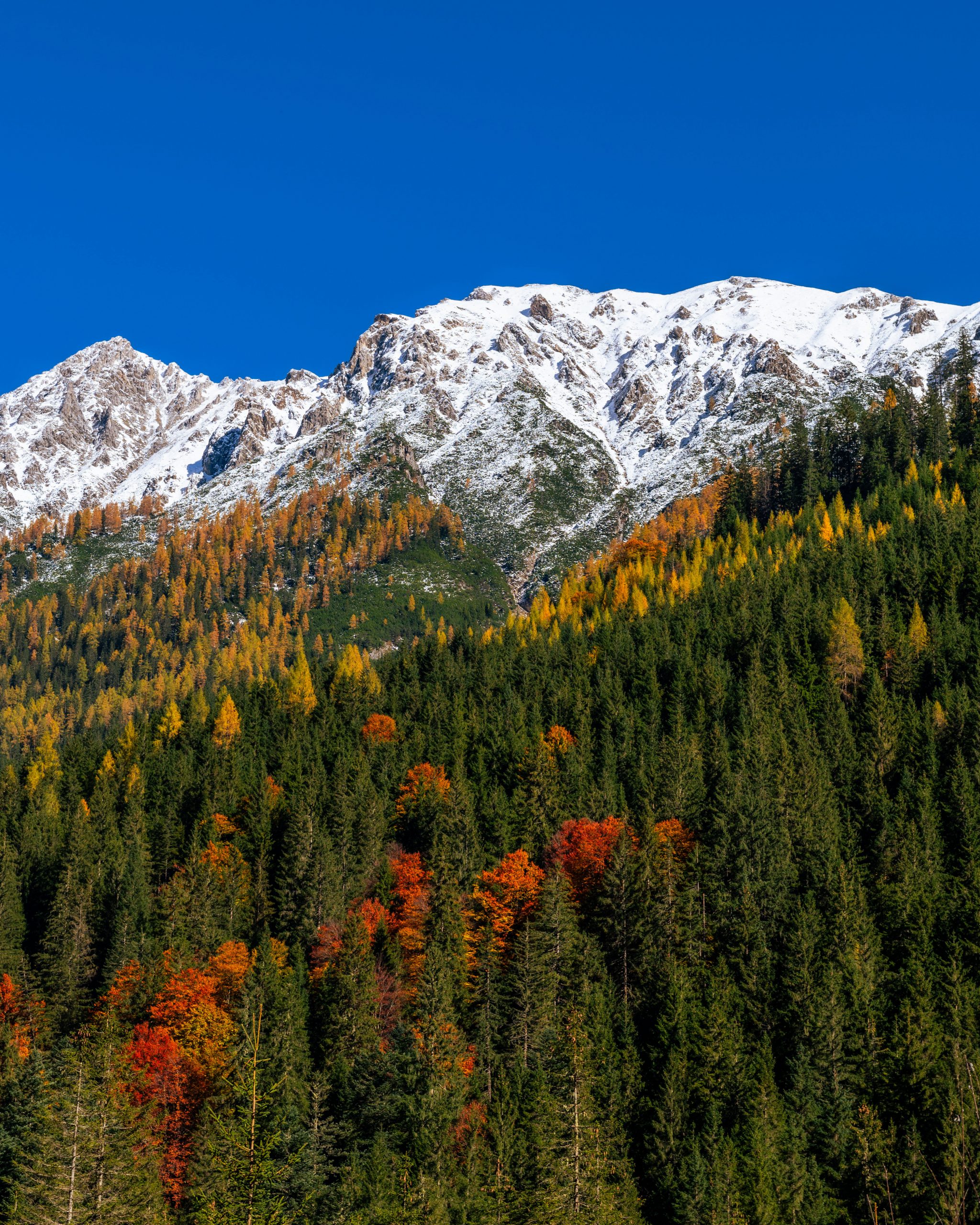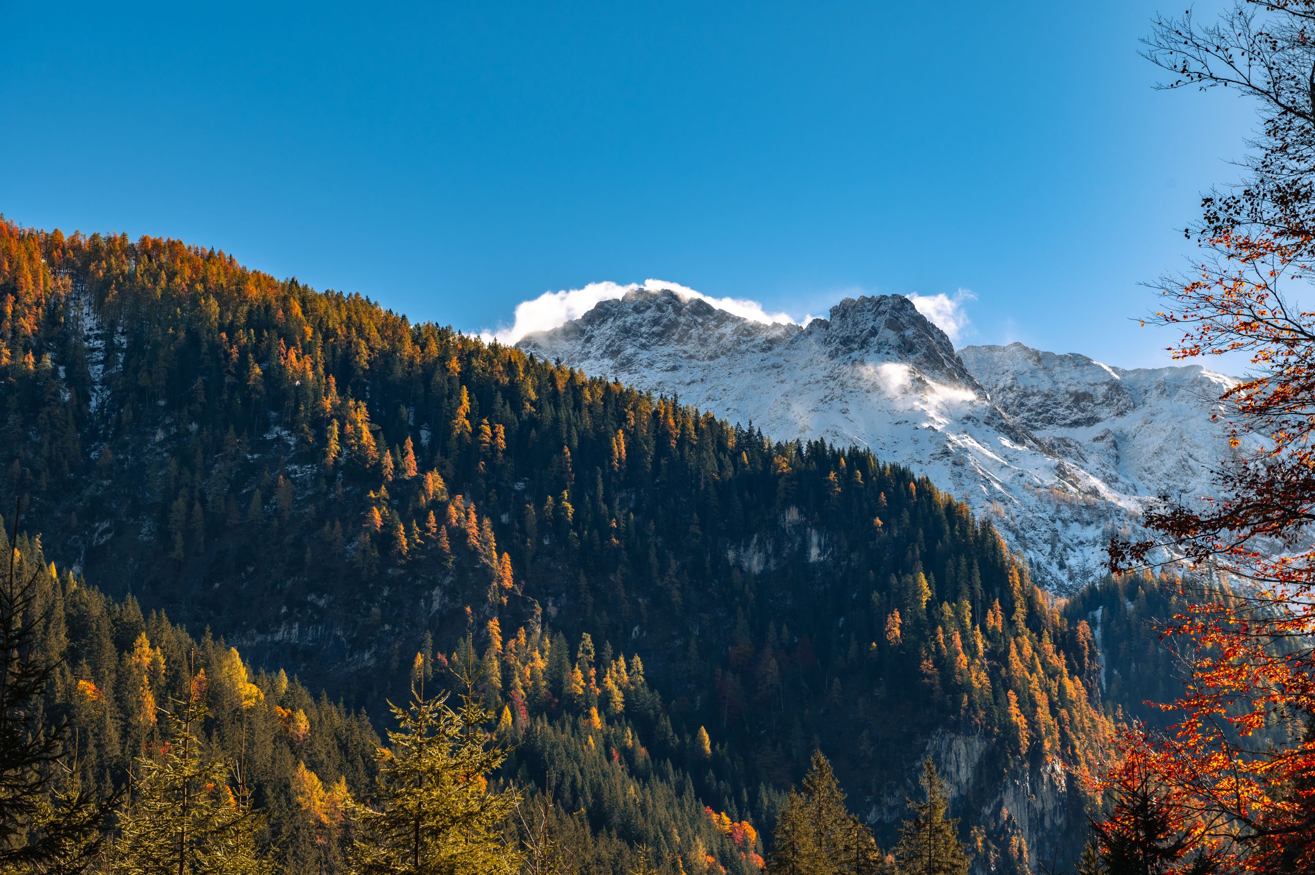 Der Wald in den Alpen wird in den höheren Lagen vor allem durch immergrüne Nadelbäume geprägt, in tieferen Lagen kommen Laubbäume dazu, welche sich im Herbst bunt färben. In Kombination mit dem ersten Schnee in Höhenlagen und blauem Himmel entstehen kontrastreiche Landschaftsaufnahmen. Es gibt dabei offensichtliche Motive, wie Berge und Bäume und vielleicht auch weniger offensichtliche, wie farbenfrohe Blätter, die in einer Pfütze am Boden liegen. Deshalb ist mein wichtigster Rat, sich einfach etwas Zeit zu nehmen und den Blick streifen zu lassen. Das Motiv, das alle fotografieren ist meistens nur das Zweitbeste.