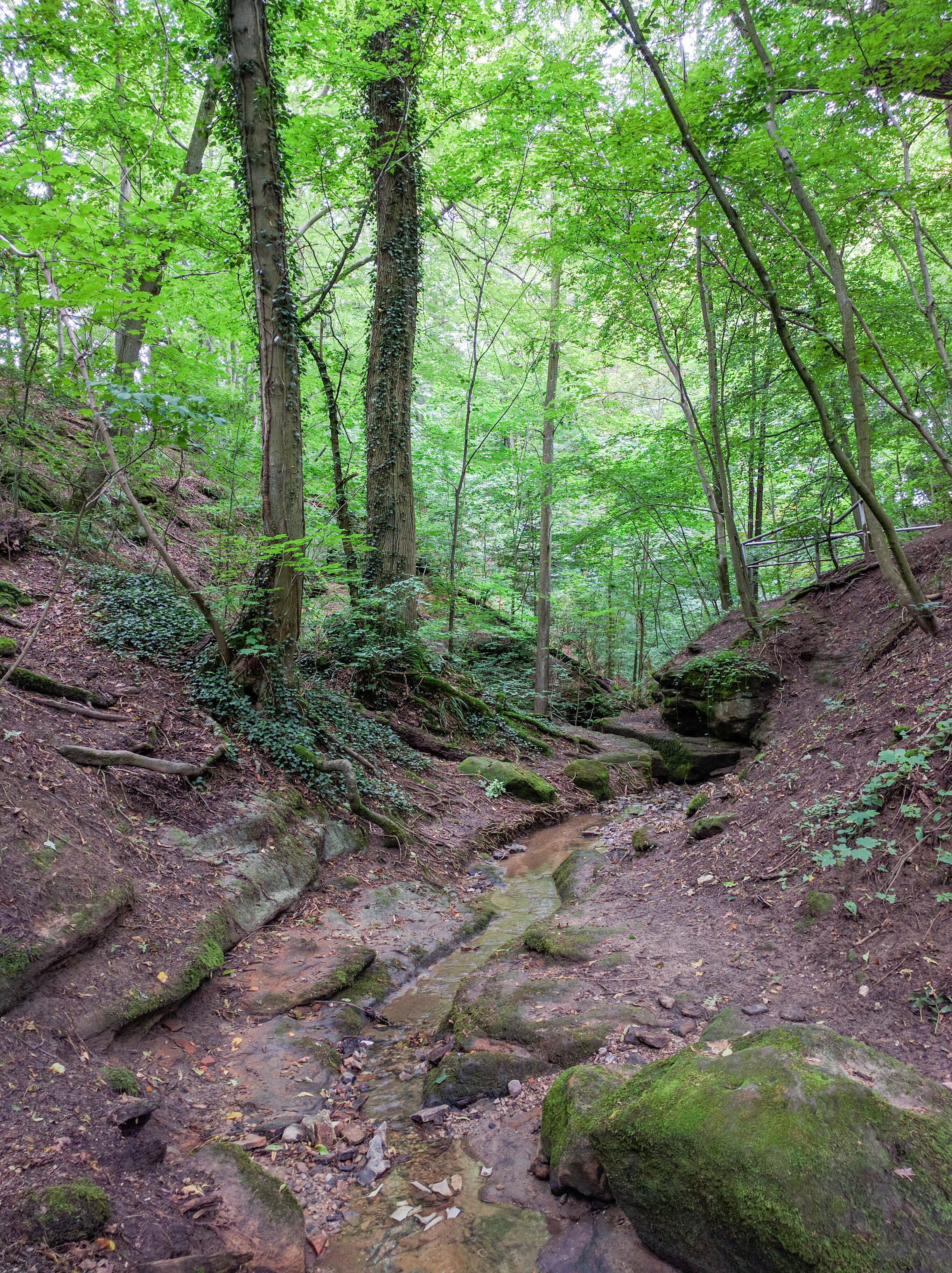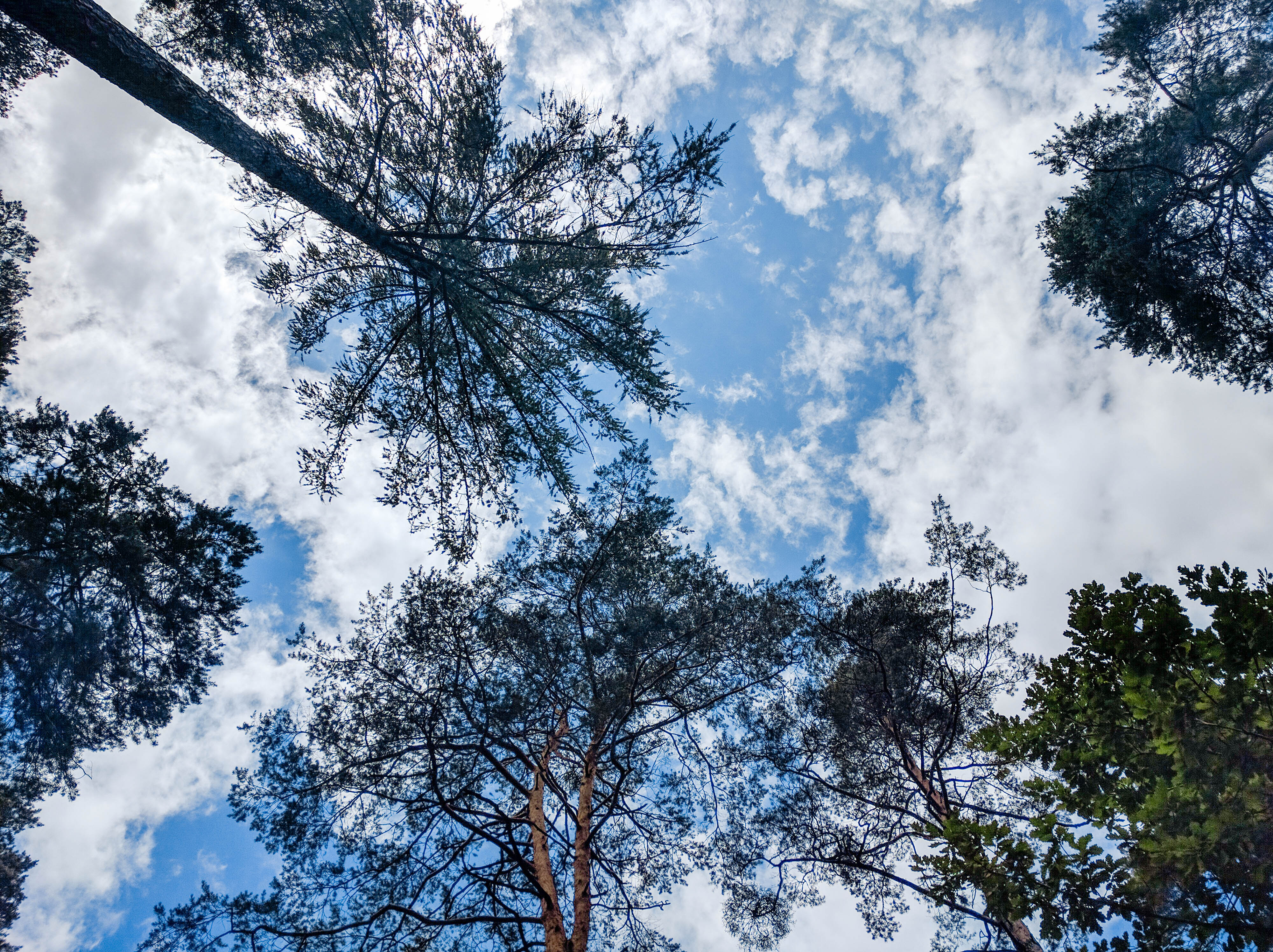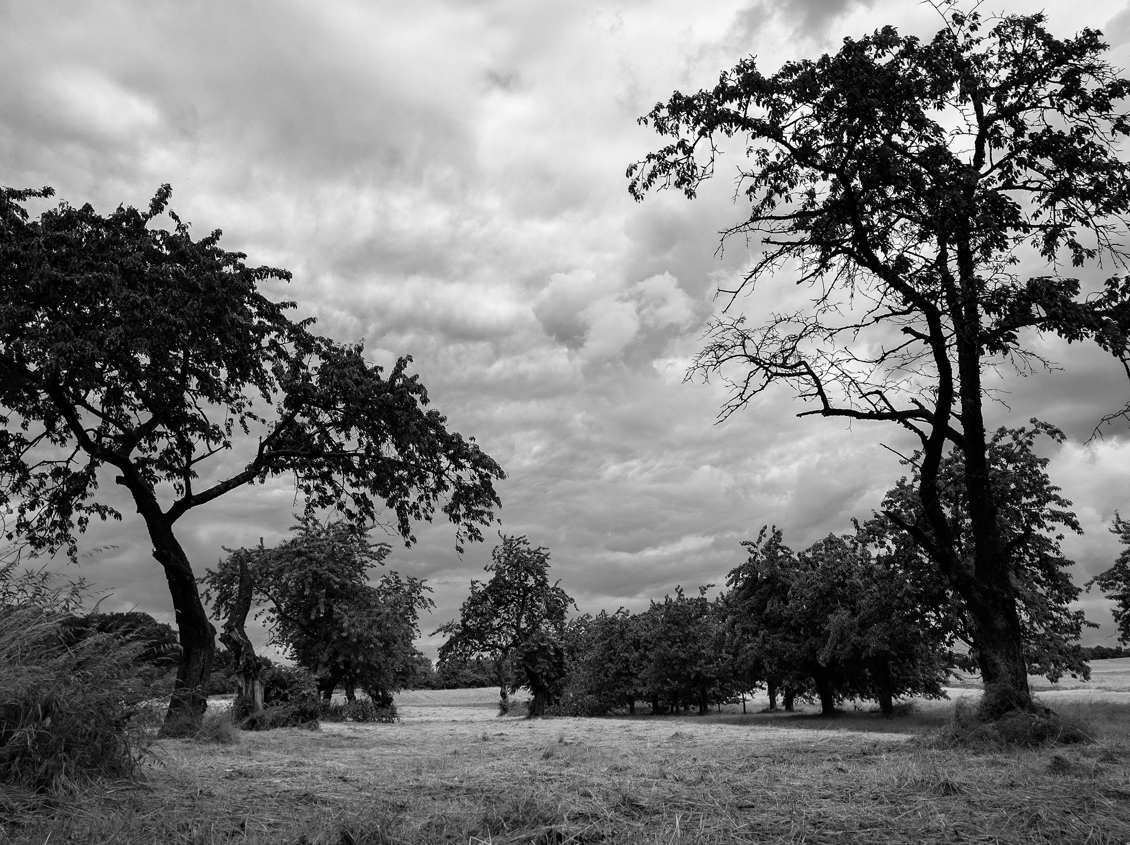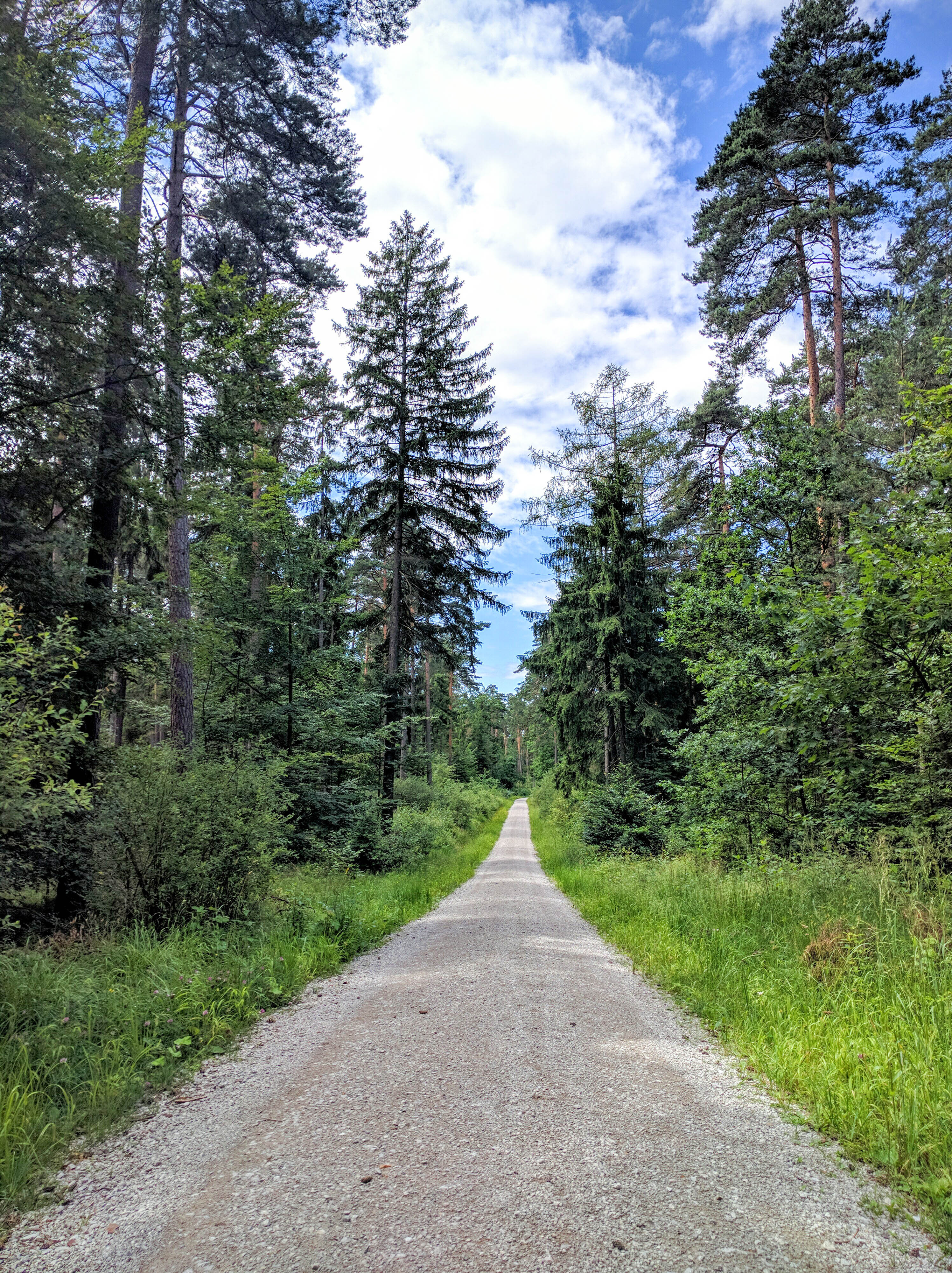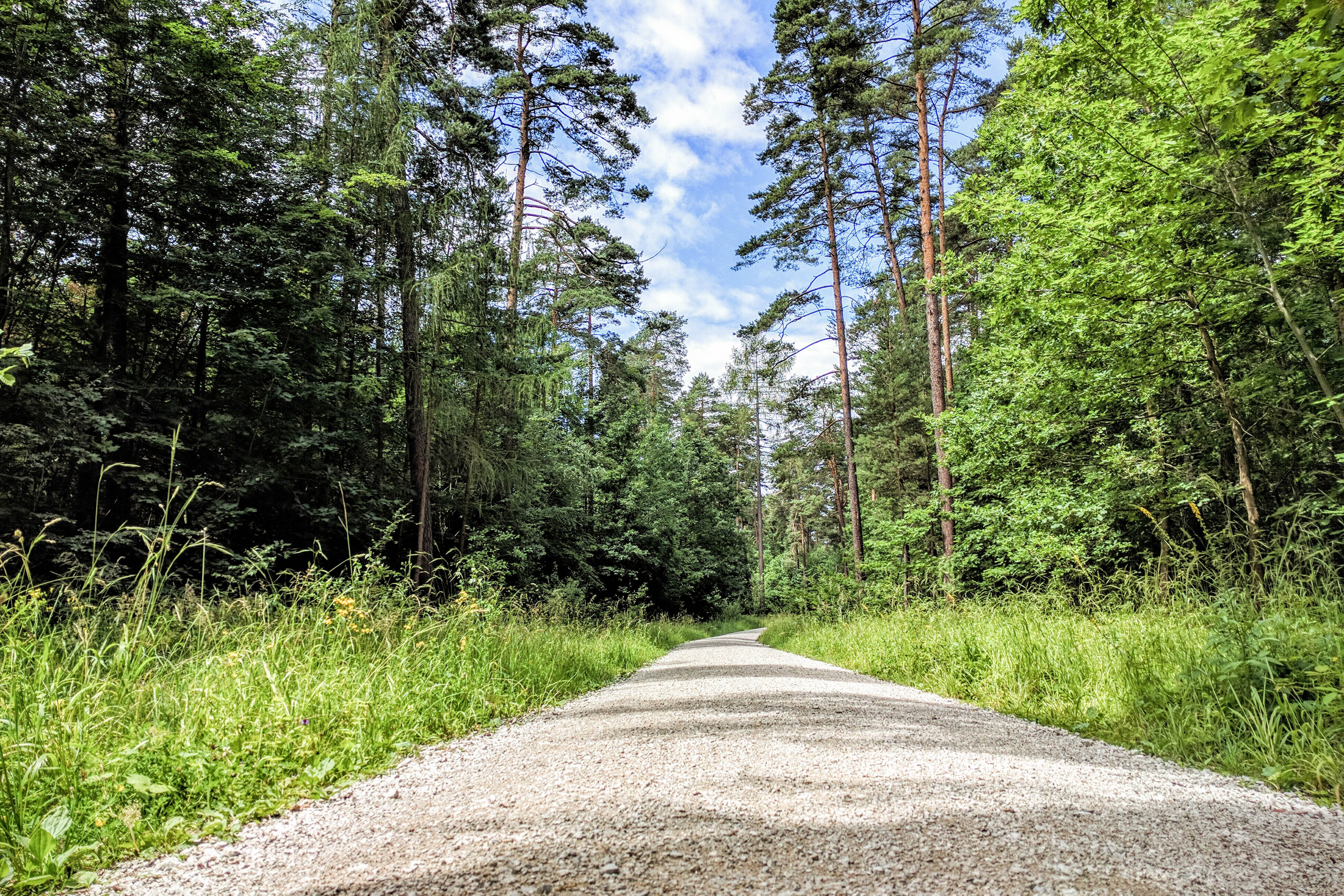Herausforderung bei diesem Bild ist, den hohen Kontrastumfang abzubilden. Sowohl der Weg als auch die hellen Wolken sollen sichtbar sein, gleichzeitig möchte ich aber auch blauen Himmel und die grünen Bäume abbilden. Ich habe die HDR-Automatik der Kamera genutzt. Die Farben sind auch nach Nachbearbeitung in Lightroom etwas zu stark gesättigt.